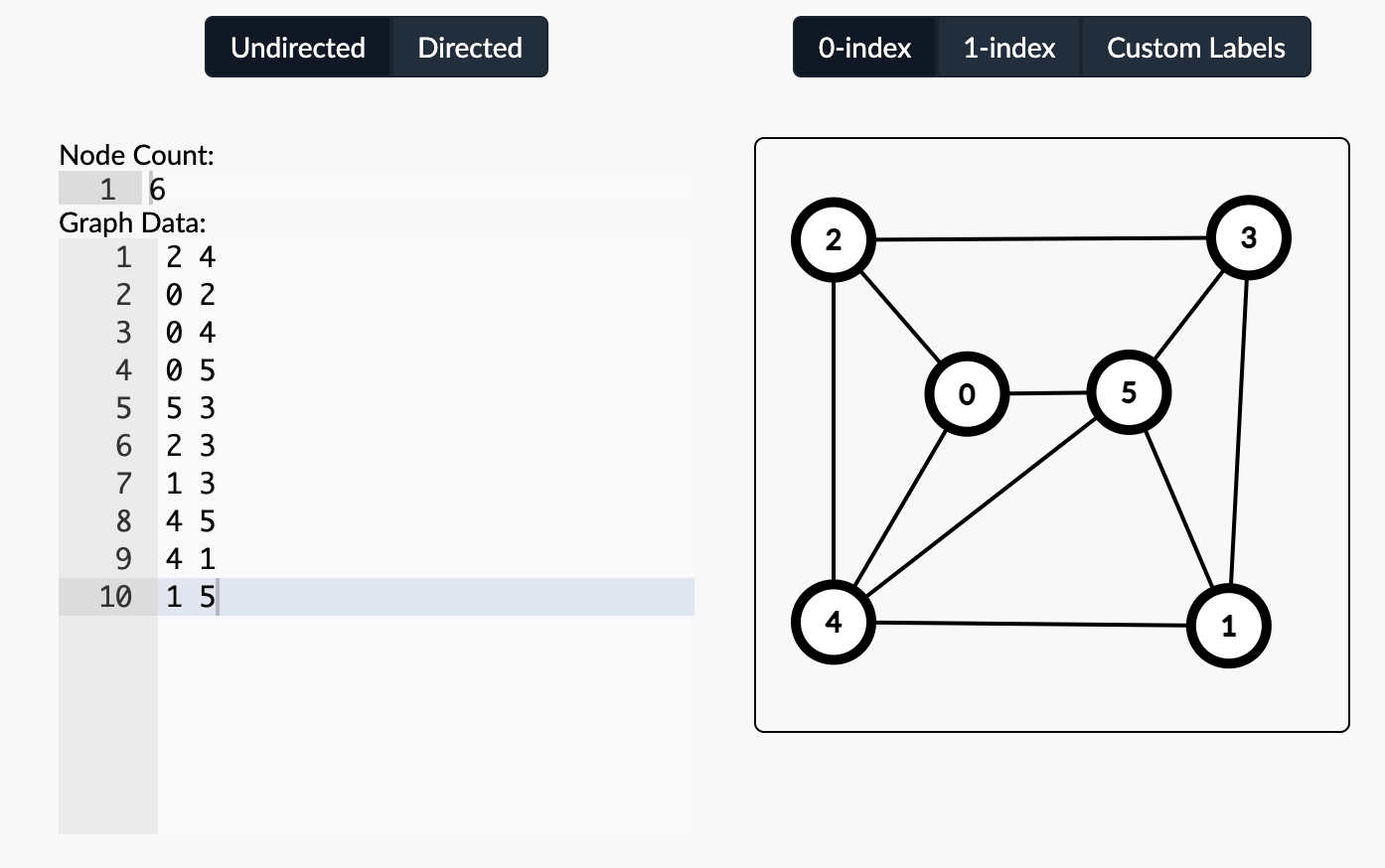 For example, the undirected graph given in the CSAcademy resource from above would be represented as the following input: